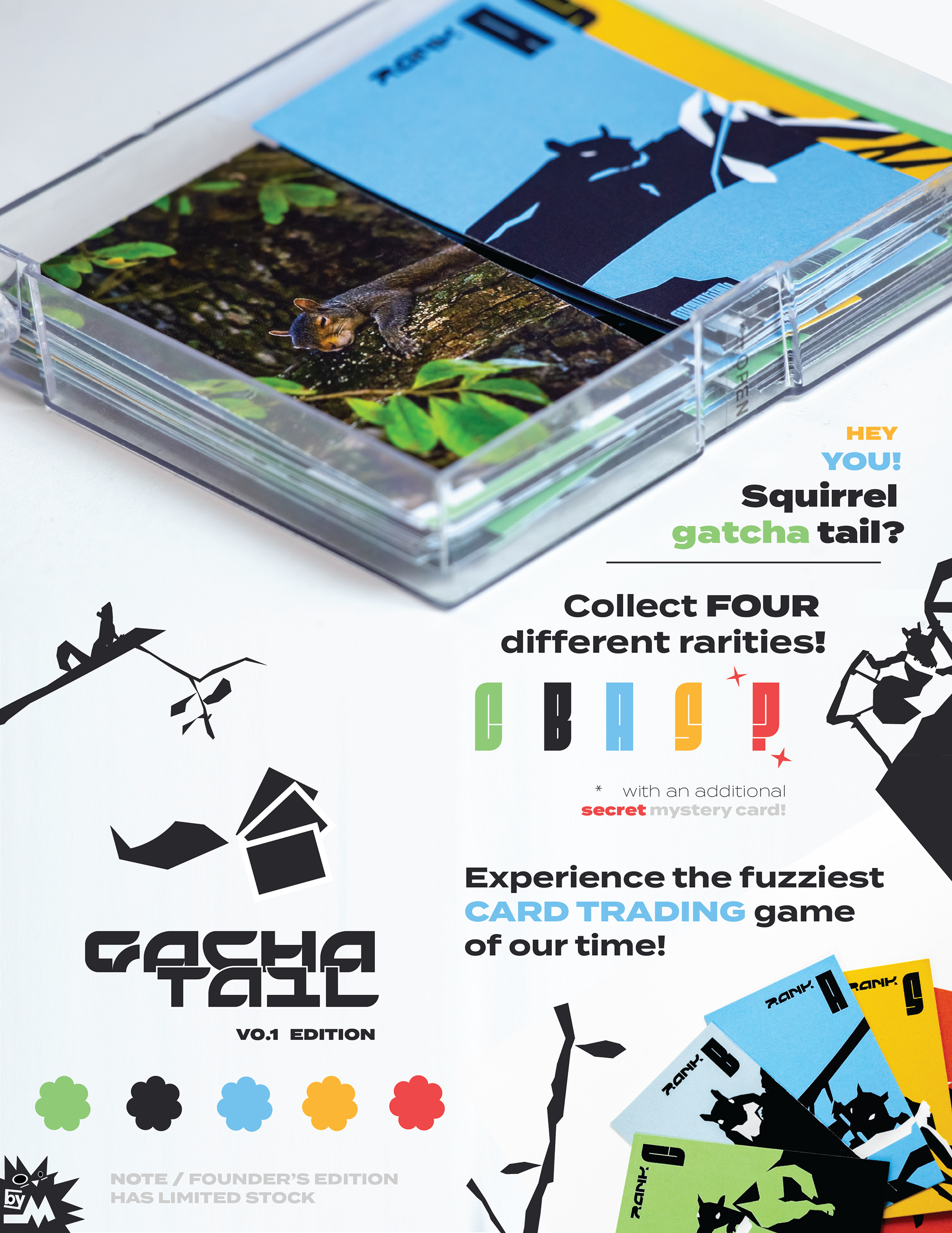 What happens when you mix squirrels and trading cards? Created using original photography and vector illustration, this first series of original cards combines my love for nature and minimalist design- and a hint of gambling. The "gatcha" part of the title is a play on words, referencing both Japanese vending machines (gashapon) due to the chanced based nature of card rarities, as well as the line's tagline "squirrel gatcha tail?" With source images selected from my personal collection of hundreds of squirrel photographs, I underwent several drafts to ensure the linework felt clean and readable, while not becoming overly complicated or losing a sense of playfulness.